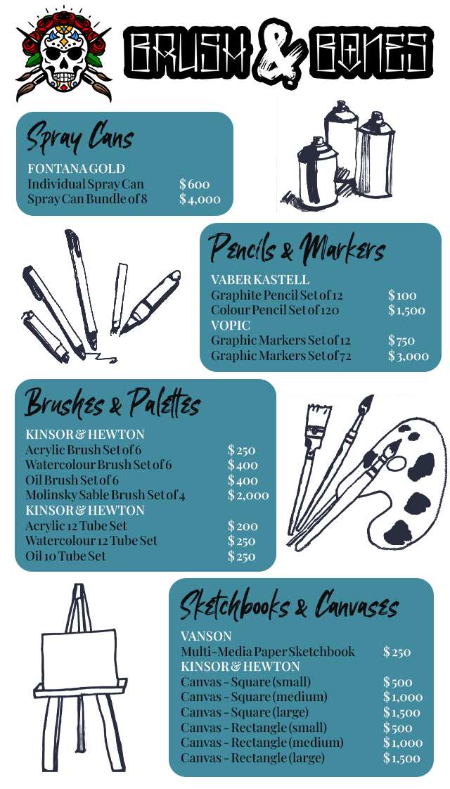 Brush & Bones is a small, independent art studio, gallery and art supply store in the Rockford Plaza. Whether you are an art collector, interested in spicing up your walls, simply bored and fancy viewing some art, or even an artist yourself; you are welcome to come and hang out here. All the art on display is for sale and created by E. Vega.